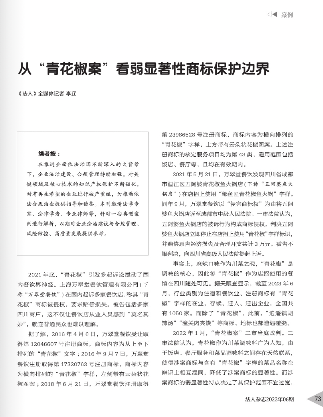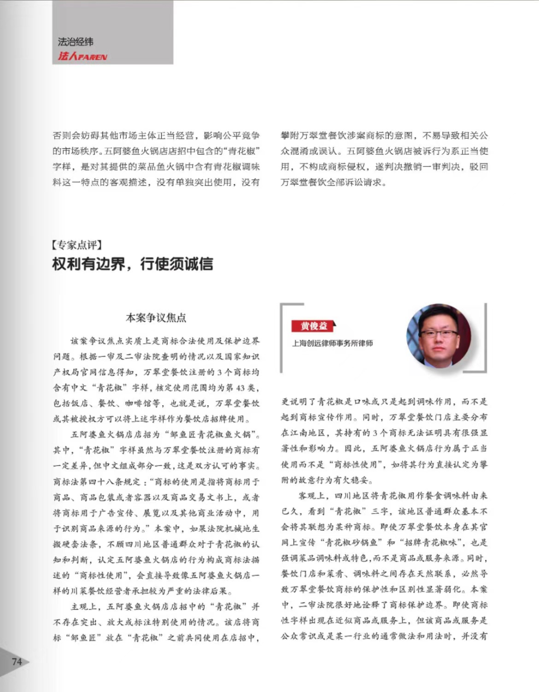 和田辉知简讯 | 辉知队黄俊益律师应“法治日报”旗下杂志邀请,就“青花椒”案发表专家点评
