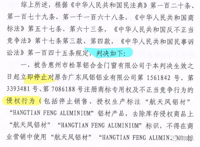 不久前,关于广东凤铝铝业有限公司与惠州市松翠铝合金门窗有限公司、新丰县新型铝材不锈钢经营部、江西普诺德铝业有限公司、江西辉煌铝业有限公司侵害商标权及不正当竞争纠纷一案,一审划上圆满句号。辉知队对侵权行为零容忍,代理原告严格追究侵权者责任,以法释法,以法普法,获法院支持,最终法院判决四被告停止侵权并赔偿损失共计250余万,判决结果如下: